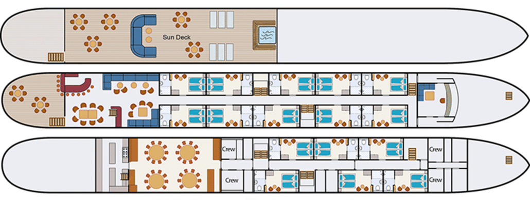 Cada uma das 16 suítes é um refúgio privativo, combinando design elegante com confortos modernos. Independentemente do deck escolhido, sua suíte oferece o ambiente de um hotel boutique com vistas para o rio em constante mudança.