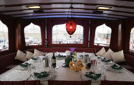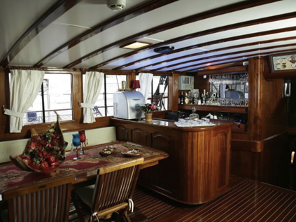 O salão espaçoso e elegantemente decorado é o coração do navio, onde os hóspedes podem saborear os deliciosos pratos da tripulação quando não for possível jantar ao ar livre. Wi-Fi gratuito está disponível no porto.
