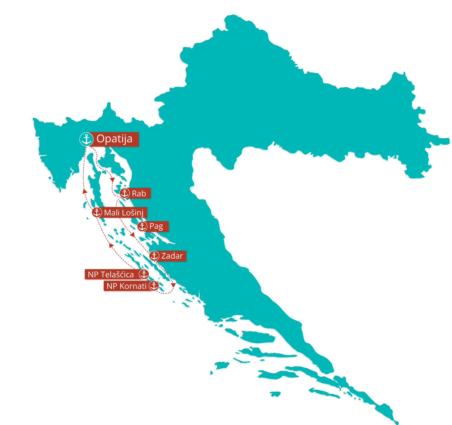 Com início e final em Opatija, esta jornada de uma semana cobre cerca de 1.070 km de rotas cuidadosamente selecionadas: trechos costeiros lendários da Jadranska Magistrala, passagens de montanha na faixa Velebit, estradas da ilha em Rab, Pag, Krk, Cres e Lošinj, além de um tempo em cidades históricas como Zadar, e portos de ilhas encantadoras.