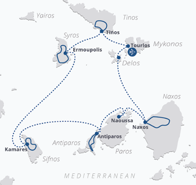 Explore as lendárias ilhas Cíclades – Mykonos, Naxos, Paros e suas vizinhas – em um iate de luxo, com bicicleta elétrica. Esta aventura única de ilha em ilha leva você ao coração perfeito do Mar Egeu, digno de cartão-postal: casas cúbicas brancas com persianas azul-cobalto, vielas estreitas e labirínticas e litorais acidentados que dão lugar ao mar azul-turquesa e praias imaculadas.