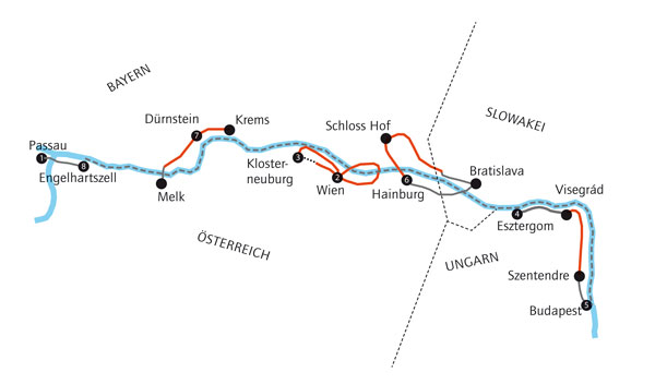 – Visitas guiadas com guias locais e entradas no Klosterneuburg, Esztergom, Visegrad e outros locais selecionados;