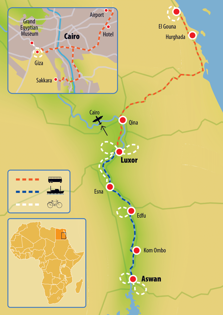Descubra o Egito ao longo de 13 dias inesquecíveis, combinando a liberdade do ciclismo com o conforto de um luxuoso cruzeiro pelo Nilo a bordo do barco HS Nebu, de classe superior, e estadias em hotéis de luxo cuidadosamente selecionados.